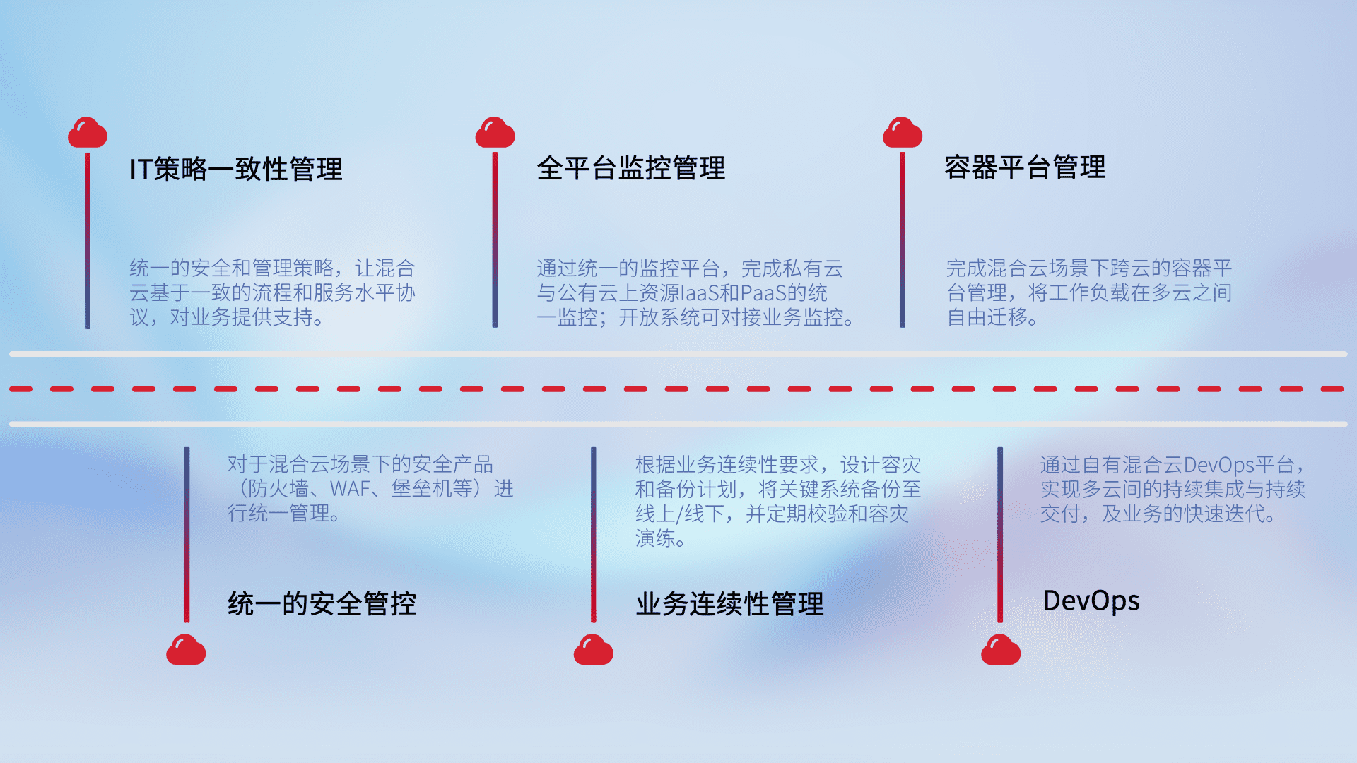 通过多云纳管,,,,以统一的资源数据模型把客户的云资源进行抽象和封装,,进而实现对多云资源的统一操作,,保障云资源管理的可靠性、、、、稳定性与可用性。。。量身定制化运维内容,,配置、、开发运维、、、补丁管理、、、、备份、、、监控、、、认证和访问管理、、、审计和日常巡检等,,保障在用云过程中的可靠度,,,,稳定度以及高可用率。。。