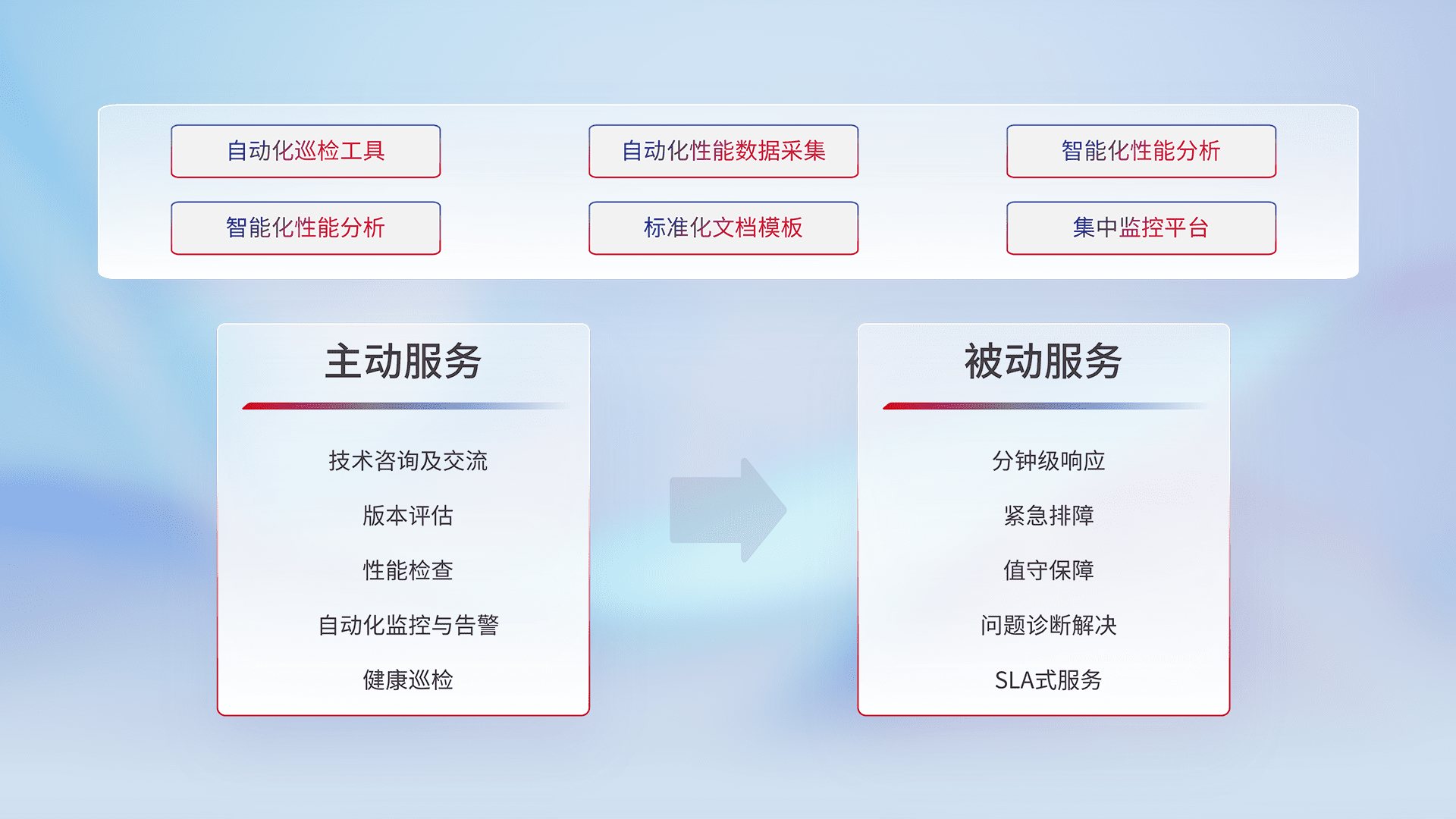 智能化工具和标准化文档,,,,保障服务质量,,,提供主动服务(包含技术咨询、、、、版本评估、、性能检查、、自动化监控与告警、、、健康巡检)和被动服务包含(分钟级响应、、、紧急排障、、值守保障、、、问题诊断解决、、SLA服务)。。。。